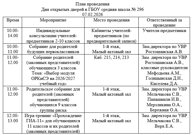 7 февраля состоится День открытых дверей. Приглашаем на собрания родителей будущих первоклассников и родителей обучающихся 3-х и 9-х классов. Для обучающихся 11 классов будет проведена игра-тренинг «ГИА-2026», в ходе которой родители и школьники смогут принять участие в различных этапах проведения единого государственного экзамена. Родители (законные представители) учащихся 2-11 классов могут по предварительной записи встретиться с учителями-предметниками и классными руководителями. Ссылка для записи активна до 6 февраля включительно: https://forms.yandex.ru/u/6980d0761f1eb5a882fb857a